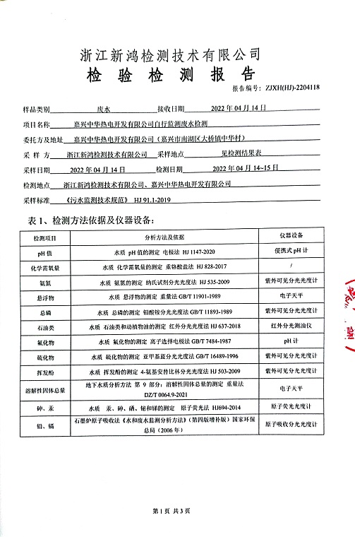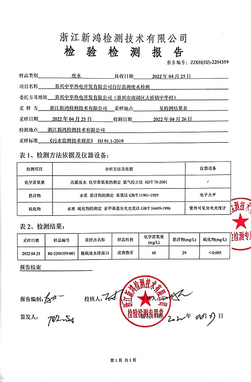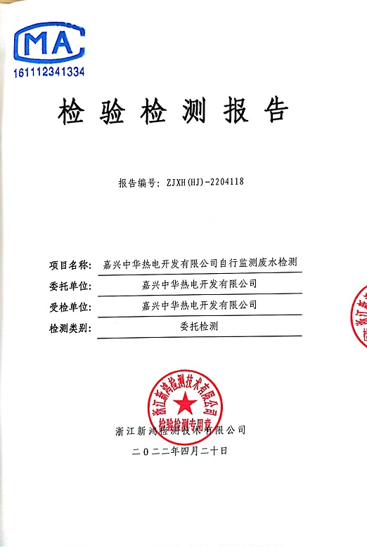 報(bào)告名稱:中華熱電2022.4月廢水檢測報(bào)告