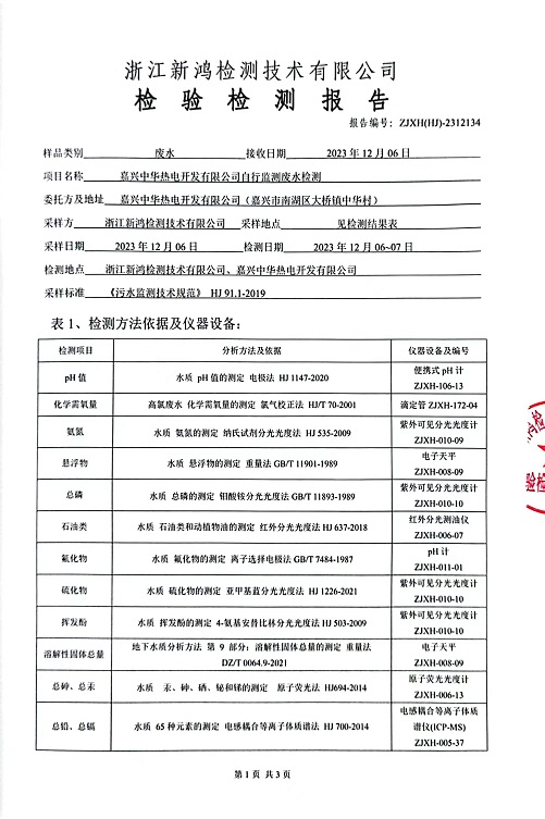 報(bào)告名稱:中華熱電2023年12月廢水檢測報(bào)告
