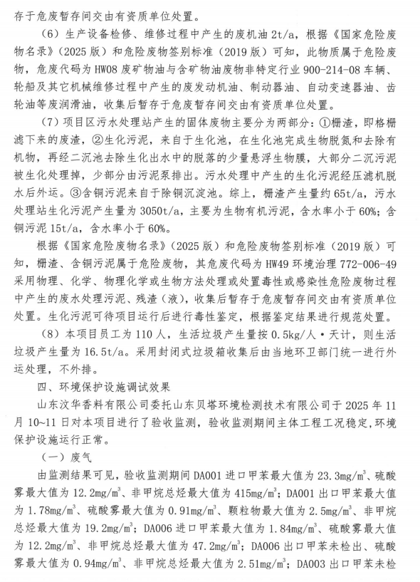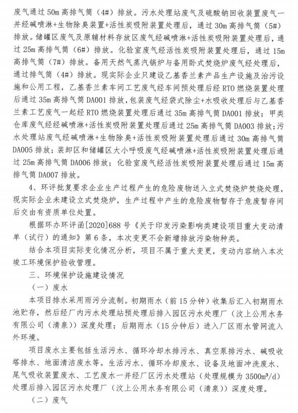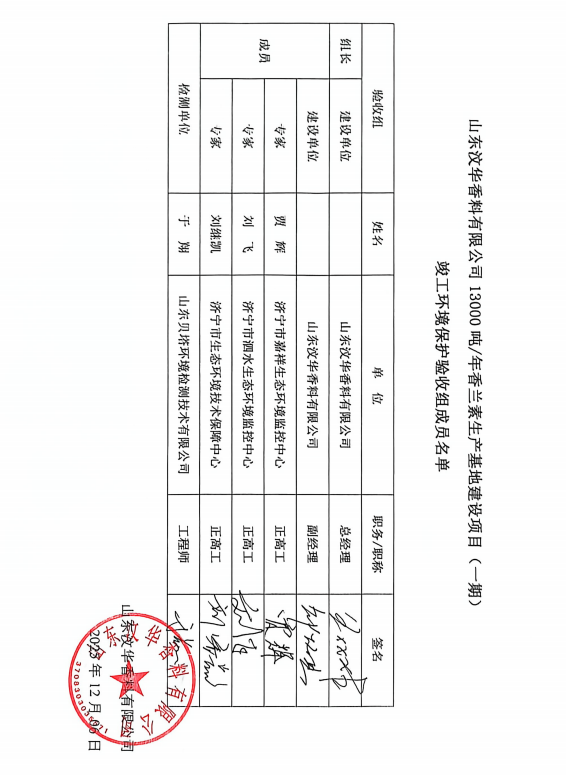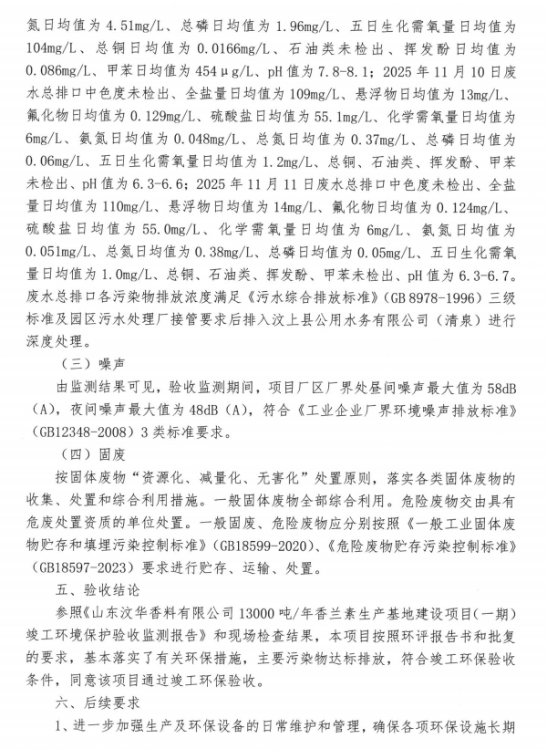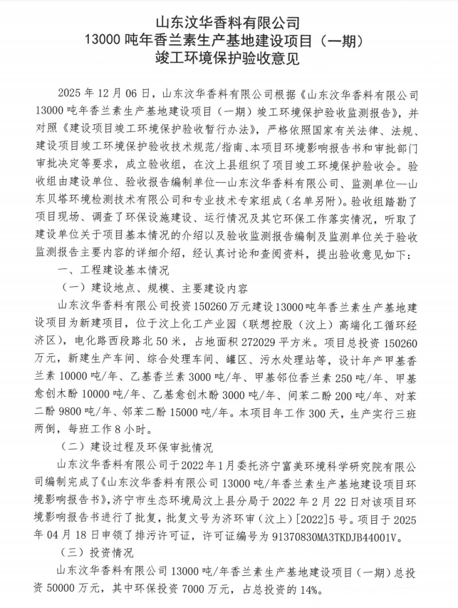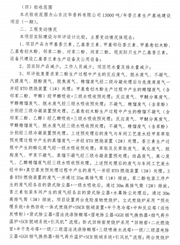 報(bào)告名稱:山東汶華香料有限公司13000噸年香蘭素生產(chǎn)基地建設(shè)項(xiàng)目(一期)竣工環(huán)境保護(hù)驗(yàn)收意見(jiàn)