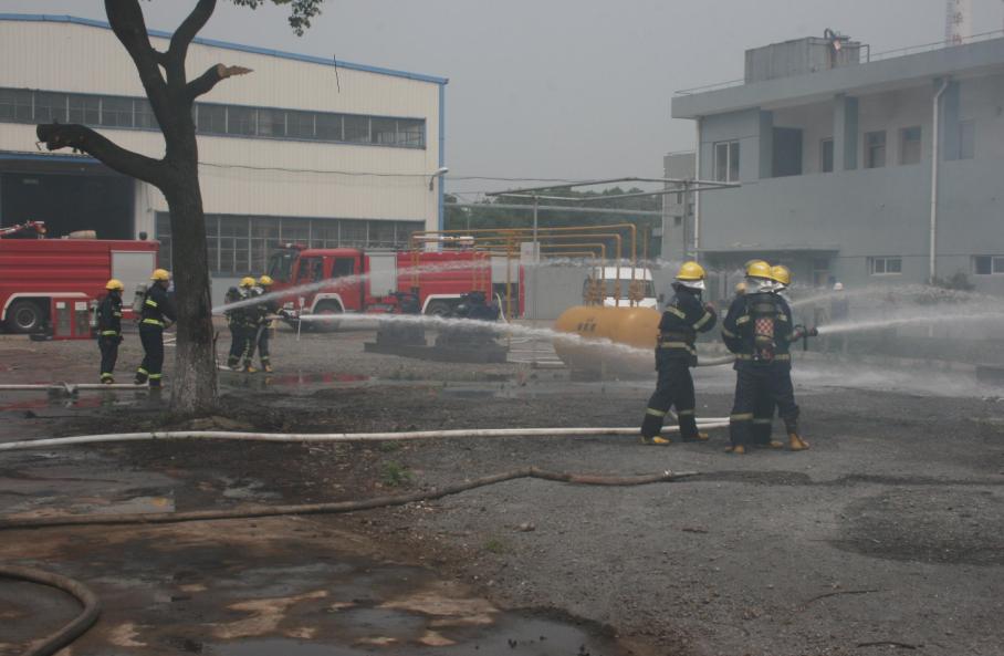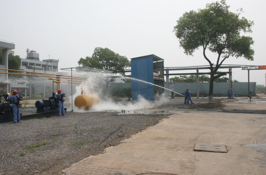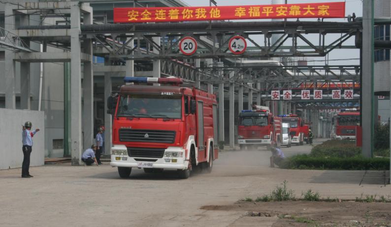 本次演練分為技能表演賽和事故演練兩個部分。技能表演賽由本公司專職消防隊員參加實施,內(nèi)容包括:“原地佩戴空呼器、水帶出水擊靶、著消防服堵漏”三個消防技能項目;事故演練部分內(nèi)容分為“液氨泄露事故應(yīng)急救援演練”和“甲苯車間火災(zāi)事故應(yīng)急救援演練”兩個項目,演練人員由南湖區(qū)消防大隊、大橋鎮(zhèn)、中華化工、衛(wèi)星石化專職消防隊等四支訓練有素的消防隊,以及中華化工企業(yè)職工、南湖區(qū)安監(jiān)局、環(huán)保局等相關(guān)工作人員參加,共計80余人參加事故應(yīng)急救援演練。